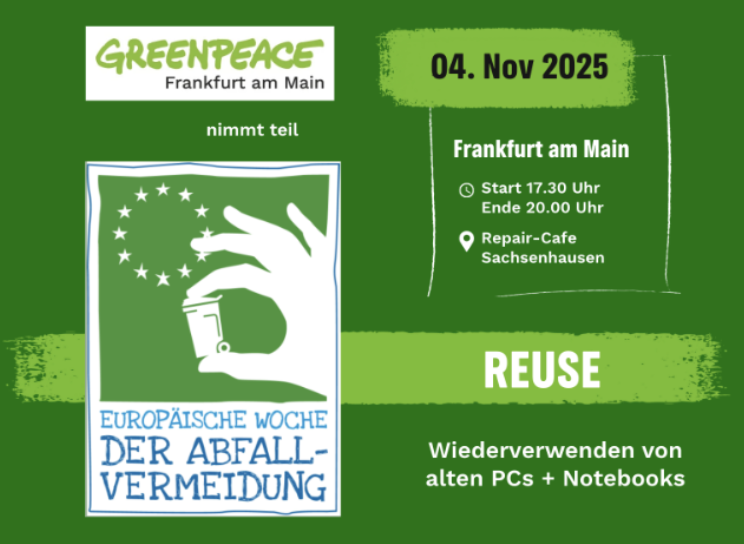 Außerdem präsentieren sich Greenpeace und LABL mit eigenen Ständen im Rahmen der Europäischen Woche der Abfallvermeidung. Greenpeace informiert über das Wiederverwenden von alten PCs + Notebooks. LABL stellt die Projekte Zero Waste City FFM & ReUseMe vor.